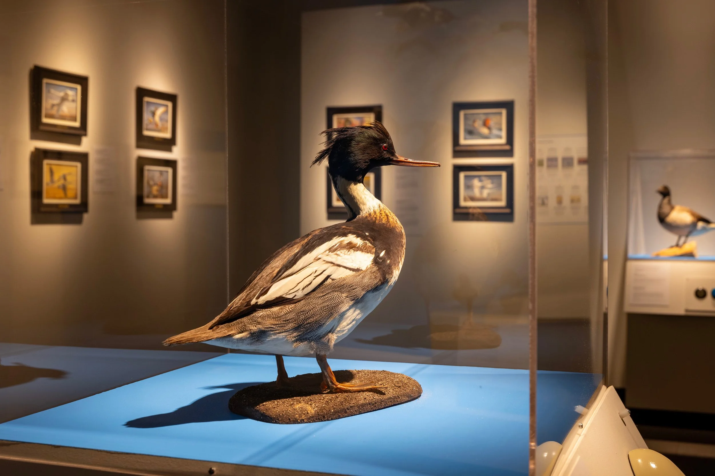 Conservation Through the Arts brings together over 60 original artworks selected for the Duck Stamp, marking the first time these historical treasures have been publicly displayed together. Alongside, visitors can see rare stamps including plate blocks and examples of the presentation panes given to the winning artist, masterful carved decoys, and taxidermy from our natural history collection. Younger visitors may enjoy interactives such as a stamp station, eggs that rotate to reveal pictures of ducklings, and buttons that play duck calls (many with unexpected tones).